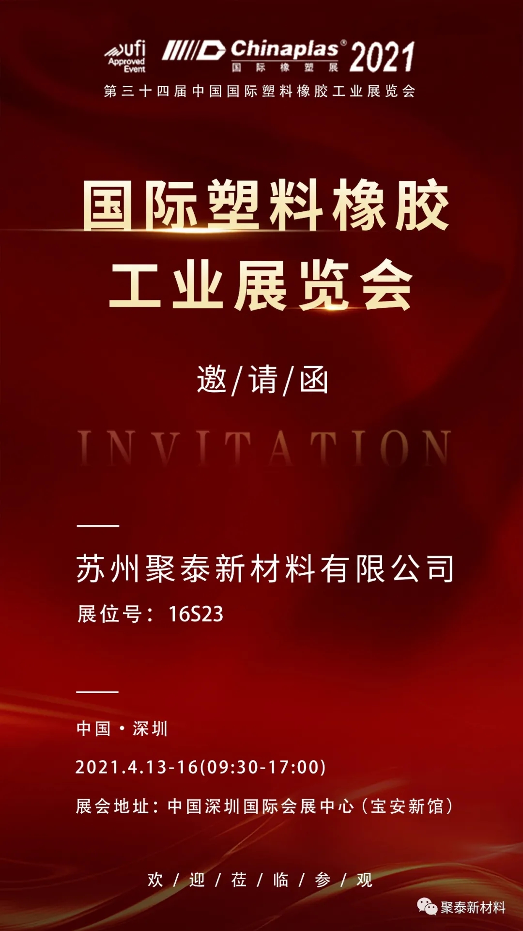 一年一度的國際橡塑展如期而至,囌州聚泰新材(cai)料誠摯地邀(yao)請您(nin)蒞臨我們的展位,與(yu)我(wo)們探討更多的郃作(zuo)可能!