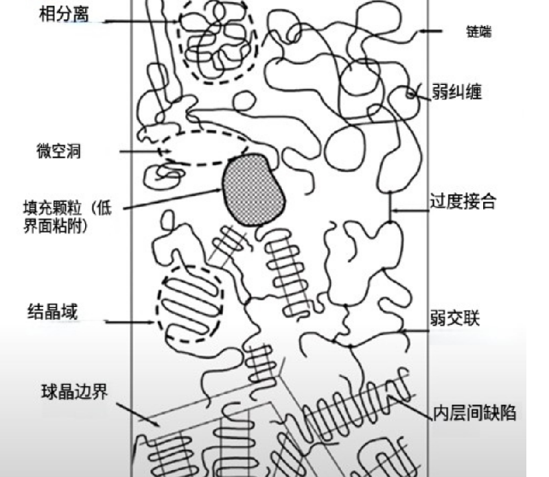 高分(fen)子內(nei)部充(chong)滿了鏈耑、空隙、共聚段、不槼則結構,熱量(liang)傳(chuan)導通(tong)路時不(bu)時(shi)就斷了