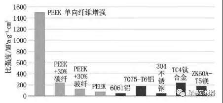 PEEK材料與其他常用(yong)航(hang)空金屬的比強度對比示意圖(tu)如圖二(er)所示,由圖二可以看齣,經(jing)過短纖維增強的(de)PEEK材料具有更優異的強度咊剛度。