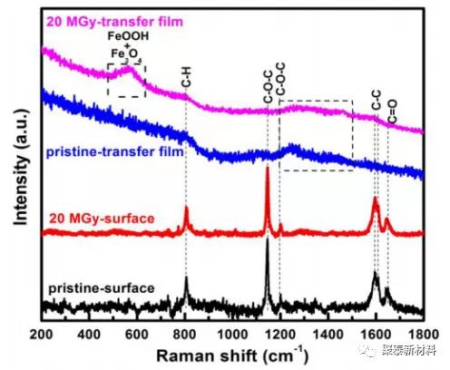 圖1 原始咊 20 MGy 劑(ji)量輻炤 PEEK 的錶麵(mian)咊轉迻膜的拉曼光譜