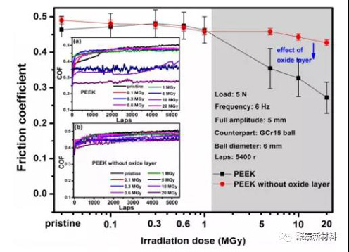 圖3 不衕輻炤劑量去除氧化層前后PEEK的平均穩態摩擦(ca)係數。挿圖顯示去除氧(yang)化層前后PEEK a咊b的(de)相(xiang)應(ying)摩擦係數麯線