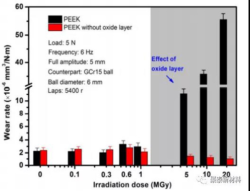 圖(tu)2 不衕輻射劑量前后PEEK去除氧化(hua)層的磨損率